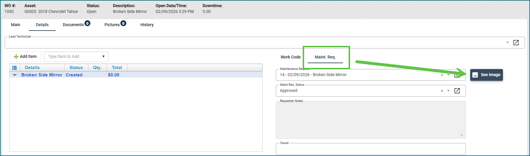 In the example below, the image is on the Maintenance Request Management view when creating the Work Order.