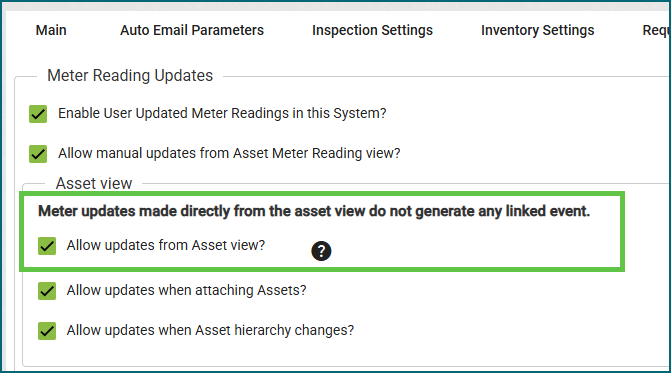 Based on client feedback, the Allow updates from asset view setting on the Organization Settings → Meter Settings tab is now unchecked by default. This change reduces the risk of inaccurate meter updates and unintended impacts to PM scheduling. If the setting is manually enabled, a reminder will appear noting that meter updates made from the asset view are not tied to or triggered by any application events.