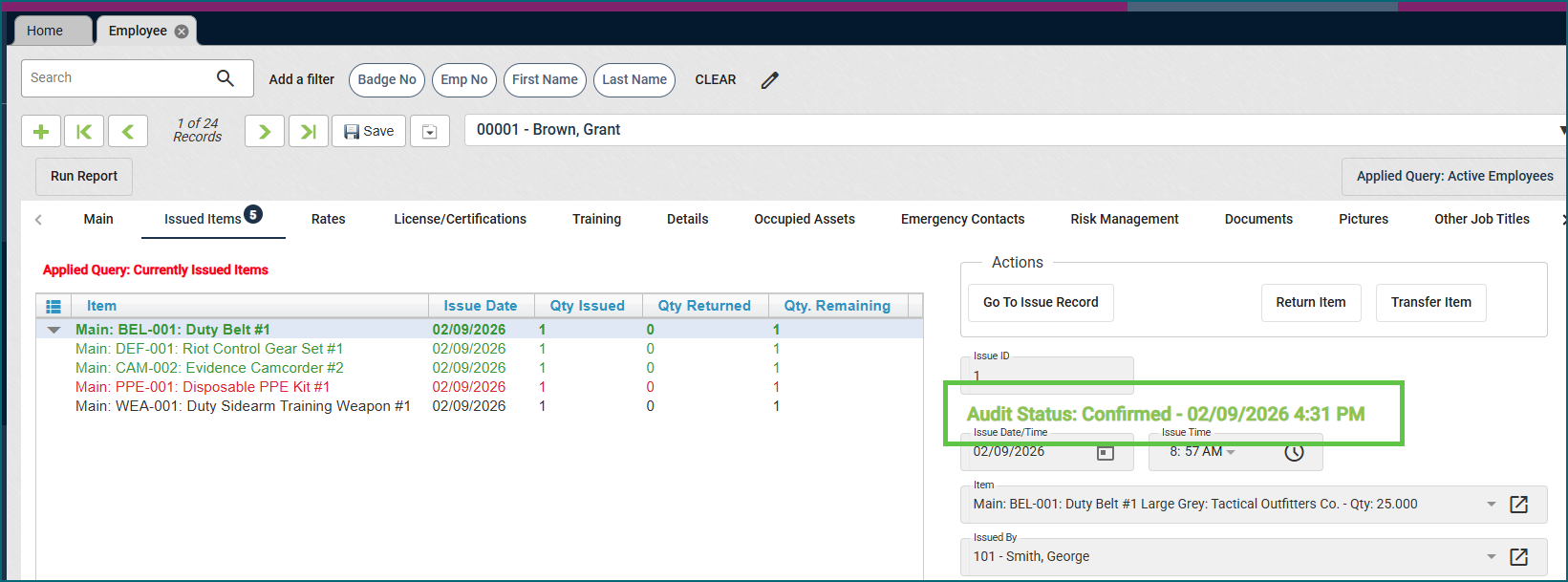 Admins now have improved visibility into employee confirmations. On the Employee View → Issued Items tab, each item is color-coded; green for confirmed, red for denied, and black for pending – making status easy to scan at a glance. Each item also displays the date and time the audit was completed. This information remains fully available in reports.