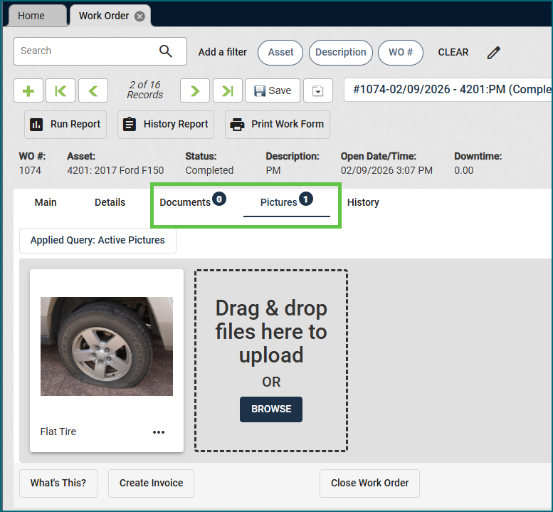 The Documents and Pictures sections on the Work Order view have been moved to tabs at the top of the screen instead of as buttons in the middle. This makes it easier to see when files have been added to a Work Order.