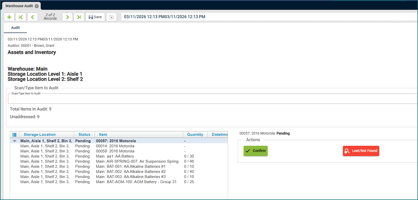 Users now have access to audit warehouses with both inventory and assets. You can set your parameters for the audit; which warehouse and location within the warehouse to search, and if you want to audit both inventory and assets or one or the other. This new workflow is available on the Warehouse Audit view and more information is available in the Warehouse Audit topic in the User Guide.