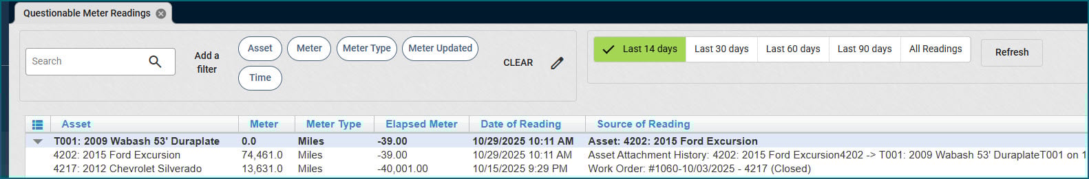 Date options have been added to the view. The default is 14 days, but users can select 14/30/60/90 days to review readings. The default timeframe will help with loading time of the view if there are an excess of questionable readings.