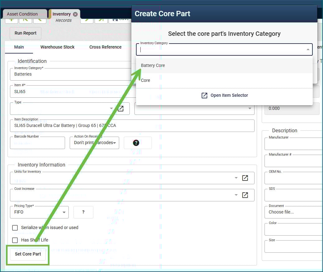We improved the workflow to associate core parts with their inventory items. Now, a button labeled “Set Core Part” is on the Inventory view when the Inventory Category has “Has a Core Part” enabled. When clicked, this will automatically make the inventory record for the core part. The Core part will still have the label of “-Core” so you can easily see which inventory items are core parts. For more information on this workflow, please see the Inventory section of the User Guide under the Core Part topic.