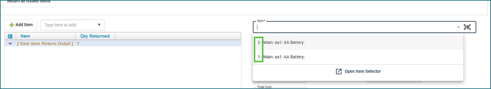 We enhanced the Item Return item selection to show the Issuance record number. This will help to determine what items have already been added to the return in the list. We also included an error message popup letting users know if the same item has been added already when saving.