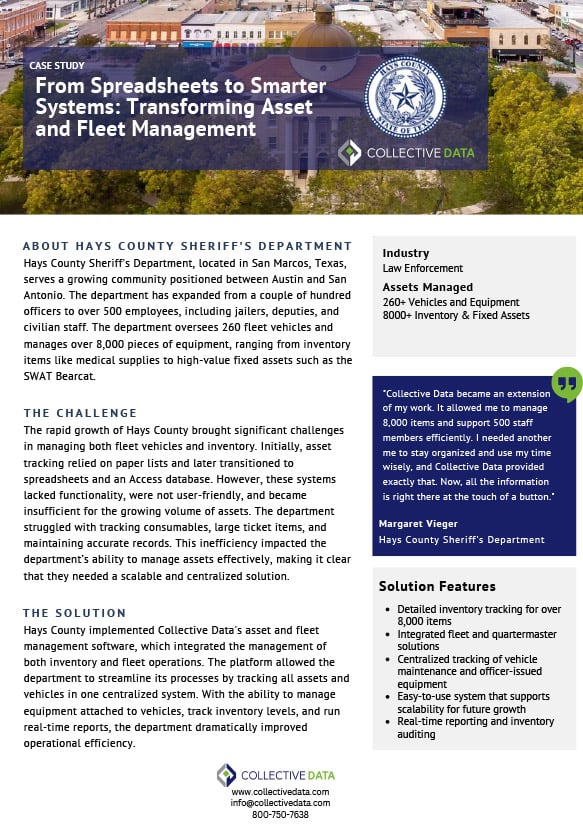 “We had no way of tracking who has what items before Collective Data. It has made my life and the lives of others here a lot easier by being able to track their inventory accurately. The system is customizable, making it the perfect fit for law enforcement. It’s made the process of issuing equipment and tracking inventory incredibly simple. We now have better visibility over our assets, and the system has even helped us reduce unnecessary spending.”